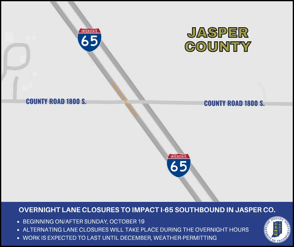 In far southern Jasper County, Region motorists are alerted to overnight lane closures that will impact southbound Interstate 65 near Remington. Beginning on or after the evening of Sunday, October 19, 2025, the Indiana Department of Transportation (INDOT) said Interstate 65 southbound will be down to one lane, with alternating lane closures taking place underneath County Road 1800 South for bridge rehabilitation. Work is scheduled to take place between the hours of 9 p.m. and 6 a.m. on weekdays and between 10 p.m. and 8 a.m. on weekends. Construction is anticipated to last until December but is weather-dependent and subject to change.