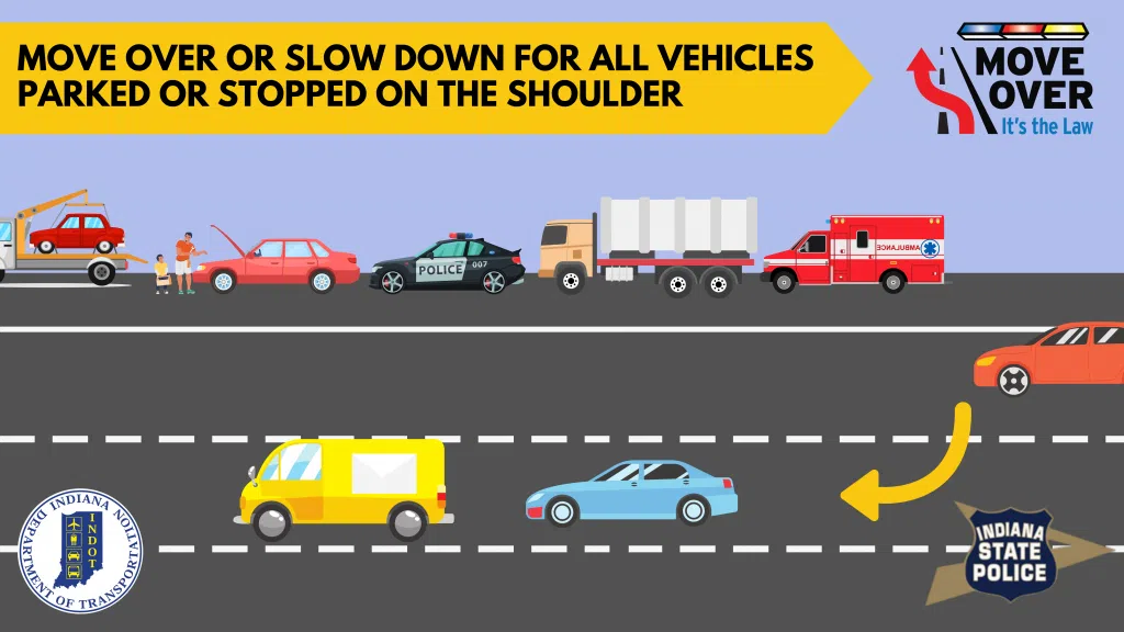 Saturday, October 18, 2025, the third Saturday in October, is National Move Over Day, which calls attention to Move Over Laws in Indiana and across the nation. Indiana State Police and the Indiana Department of Transportation (INDOT) are urging motorists to move over and slow down for emergency vehicles with flashing lights and for disabled vehicles on the side of the road. Indiana State Police Supt. Anthony Scott says Indiana’s Move Over Law has been in place since 1999. Indiana State Police say it was revised in 2023, mandating that drivers must move over for all stationary vehicles with active flashing lights. This includes law enforcement, emergency services, fire, highway or construction crews, tow trucks, utilities, and disabled vehicles. Officials say if a driver is unable to safely move over, they should slow down to 10 mph below the posted speed limit. “Moving over, and at minimum, slowing down not only for INDOT crews and Hoosier Helpers, but anyone stopped on the side of the road, saves lives,” said INDOT Commissioner Lyndsay Quist. “We want everyone to go home safe to their loved ones at the end of the day, drivers and their passengers included.” According to AAA, in 2023, 14 people were killed in Indiana outside of a stopped or disabled vehicle, a news release said.