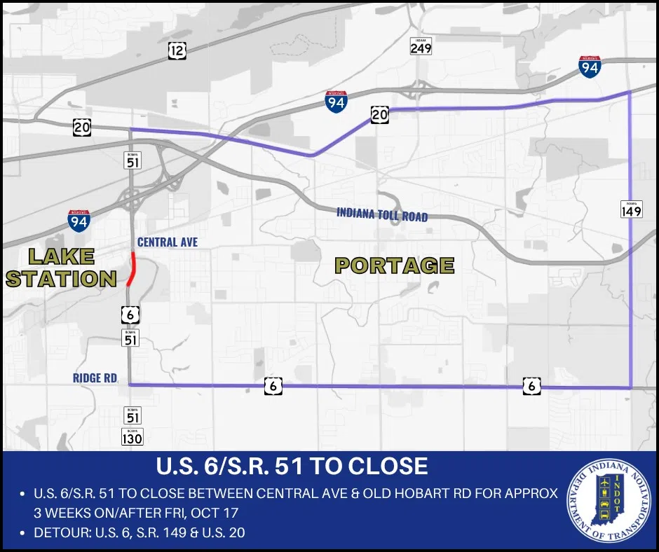 In Lake County, the Indiana Department of Transportation (INDOT) says NIPSCO is closing State Road 51 between Central Avenue and Old Hobart Road in Lake Station for about three weeks starting on or after Friday, October 17, 2025. An advisory said the closure is for NIPSCO gas relocation work. The official detour will follow U.S. 20, State Road 149, and U.S. 6.