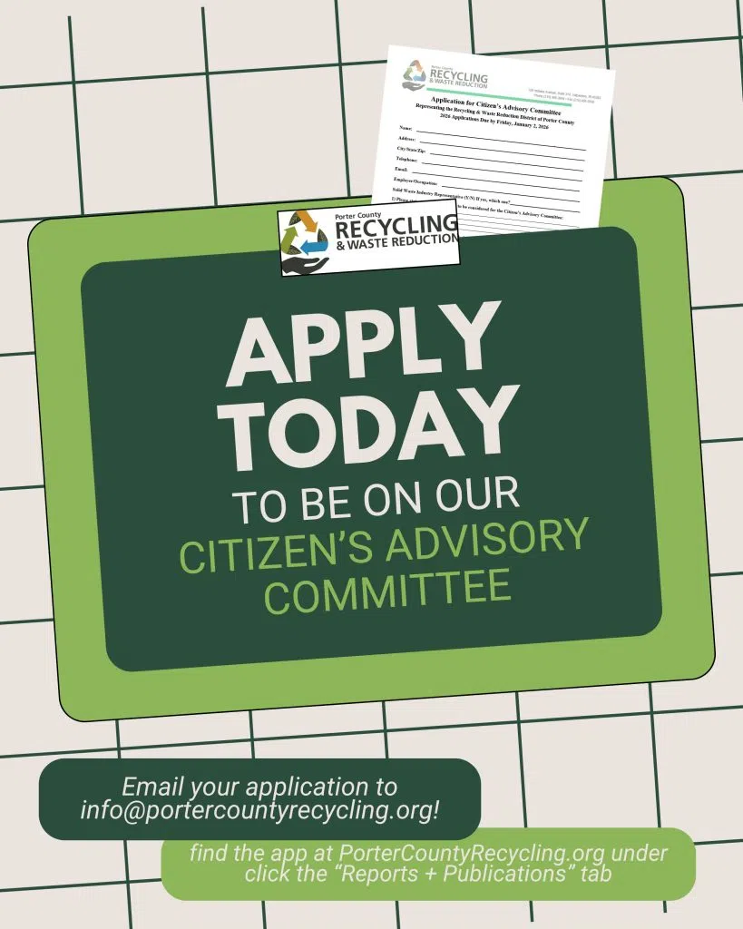 In Porter County, the Recycling and Waste Reduction District is currently accepting applications for its Citizen’s Advisory Committee. The application period is open until January 2, 2026. The committee is made up of Porter County residents and meets four to six times a year to devise strategies for improving waste reduction efforts throughout the county. “If you are enthusiastic about environmental stewardship and community service, we encourage you to apply,” a news release from the district said. Members are appointed annually. To apply, go to PorterCountyRecycling.org , under the About Us tab find “Reports + Publications”. Scroll down to the Citizen’s Advisory Committee and click on the Application, then email the finished application to the district.