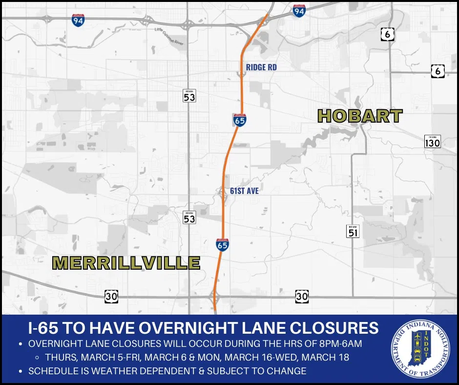 In Lake County, the Indiana Department of Transportation (INDOT) says there will be overnight lane closures on Interstate 65 between Interstate 80/94 and U.S. 30 for pavement marking. Removal of the temporary markings is scheduled to begin 8pm Thursday March 5, 2026, to 5am Friday March 6, 2026. Weather permitting, application of the permanent pavement markings will occur over two nights beginning on or after Monday March 16, 2026, 8pm to 6am. Pavement markings are weather sensitive so the painting schedule is subject to change, and pavement markings also need to be applied at certain temperature thresholds based on the product, the announcement said. INDOT says when pavement patching and bridge work on I-65 extend into late fall, permanent pavement markings are often not conducted until temperatures begin to rise again at the end of winter.